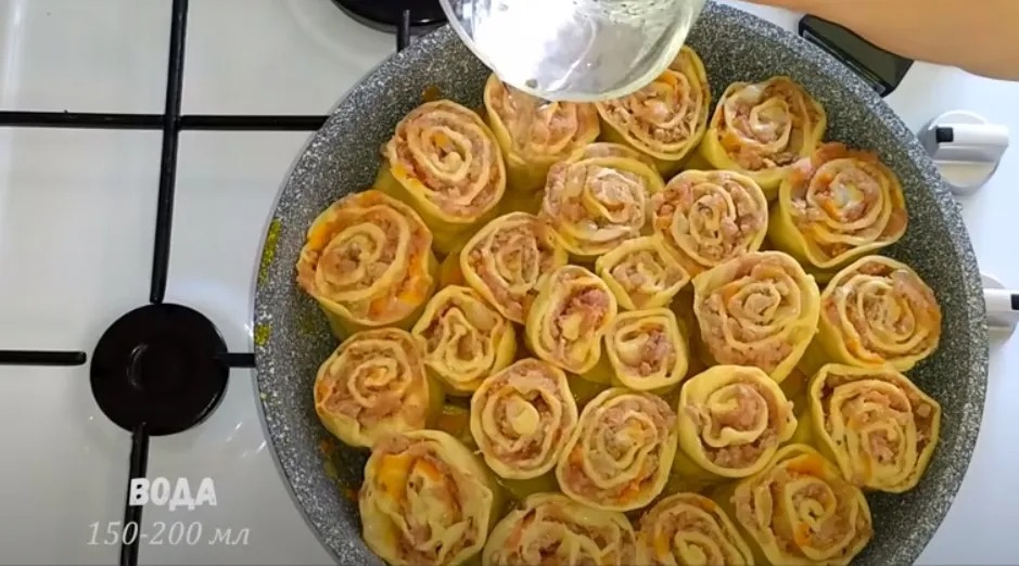 Ріжемо його на порційні рулетики і викладаємо шаром на картоплю в сковороді.