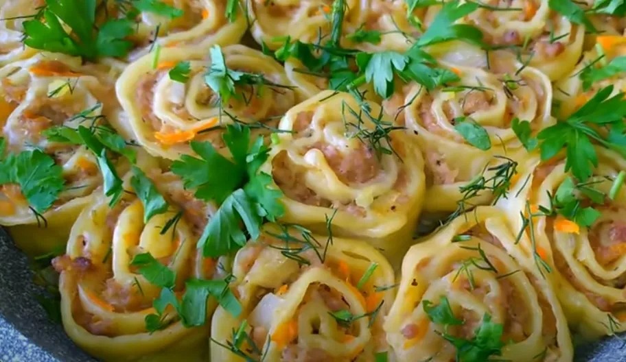 Тісто розкатуємо в тонкий пласт, викладаємо фарш рівним шаром і звертаємо рулет.