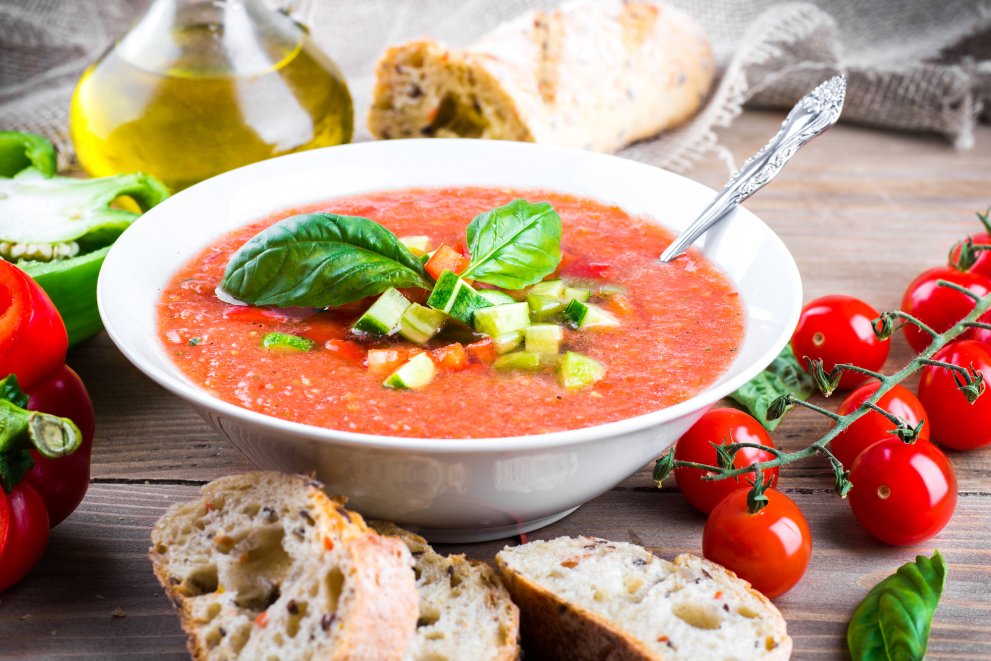 Влітку немає куточка в Іспанії, де ви не знайдете цей холодний суп. Для його приготування використовують сезонні інгредієнти: помідори, огірки, перець, часник, оливкову олію та хліб. Овочі пюрують і додають замочений у воді хліб — ось і все! Легка та освіжаюча страва, яку можна з’їсти у спекотний день, готова.
